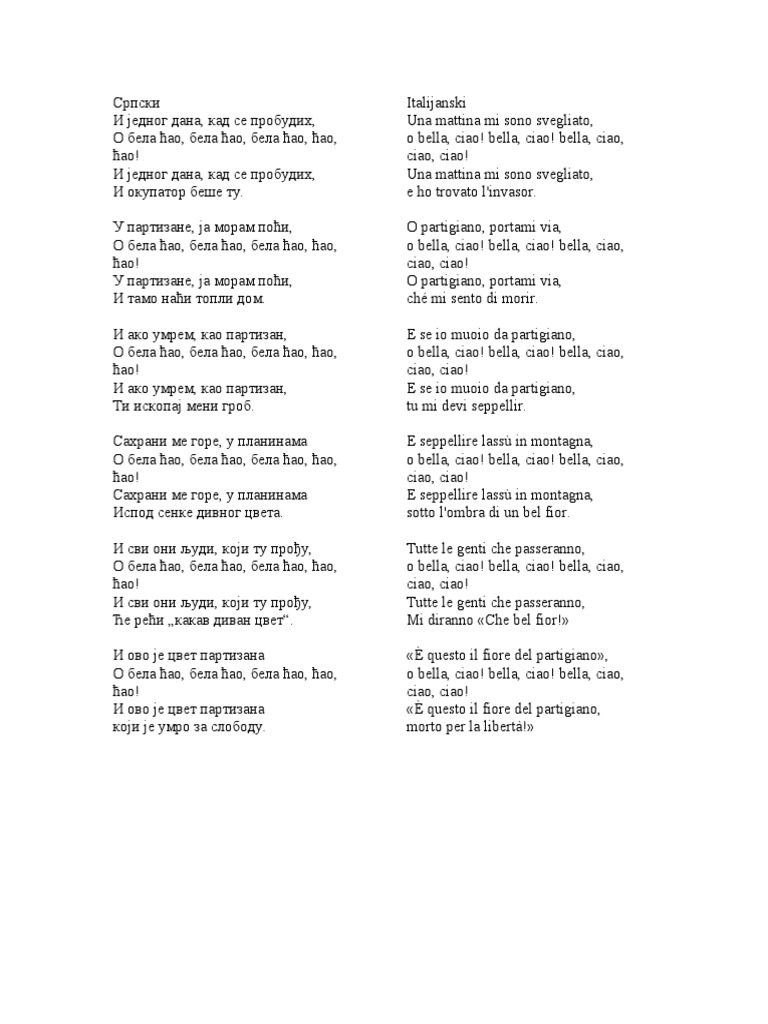 Partisanen kommt nehmt mich mit euch Bella Ciao bella ciao bella ciao ciao ciao Partisanen kommt nehmt mich mit euch denn ich fühl der Tod ist nah. O Schöne tschau Schöne tschau Schöne tschau tschau tschau Eines Morgens erwachte ich An diesem Morgen bin ich aufgestanden. Ciao ist im italienischen eine gängige und freundschaftliche Verabschiebung sowie Begrüßung.